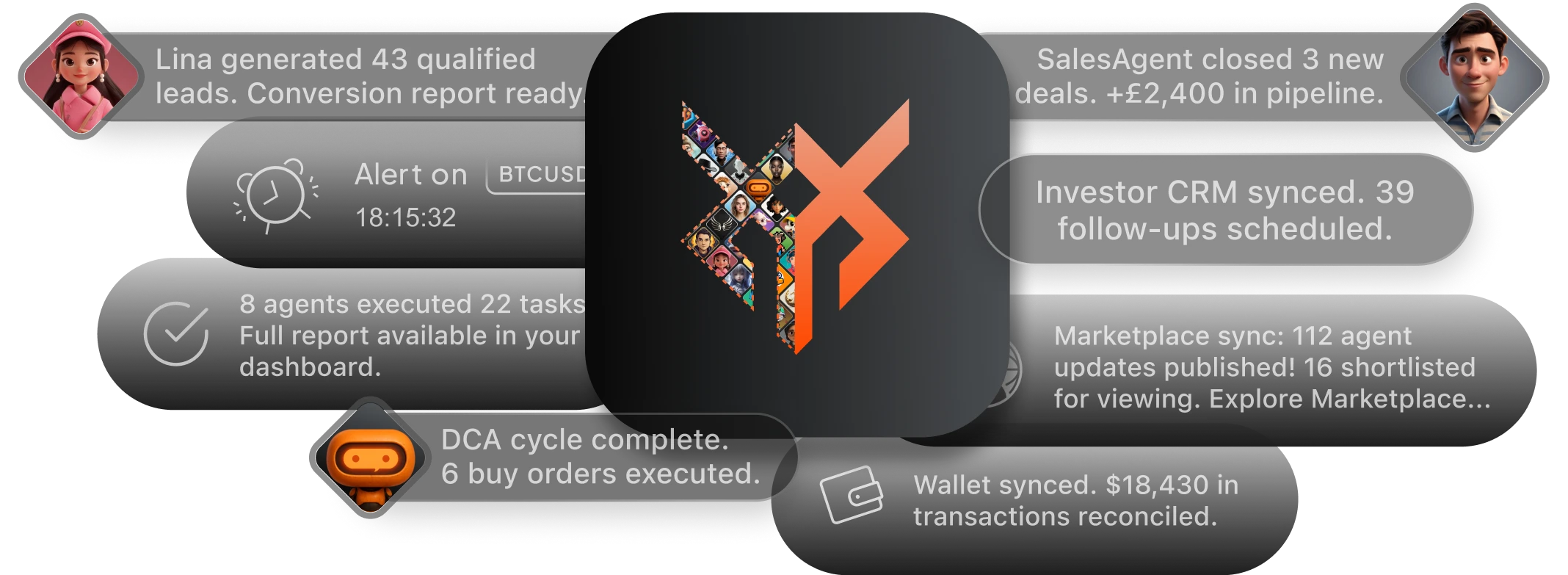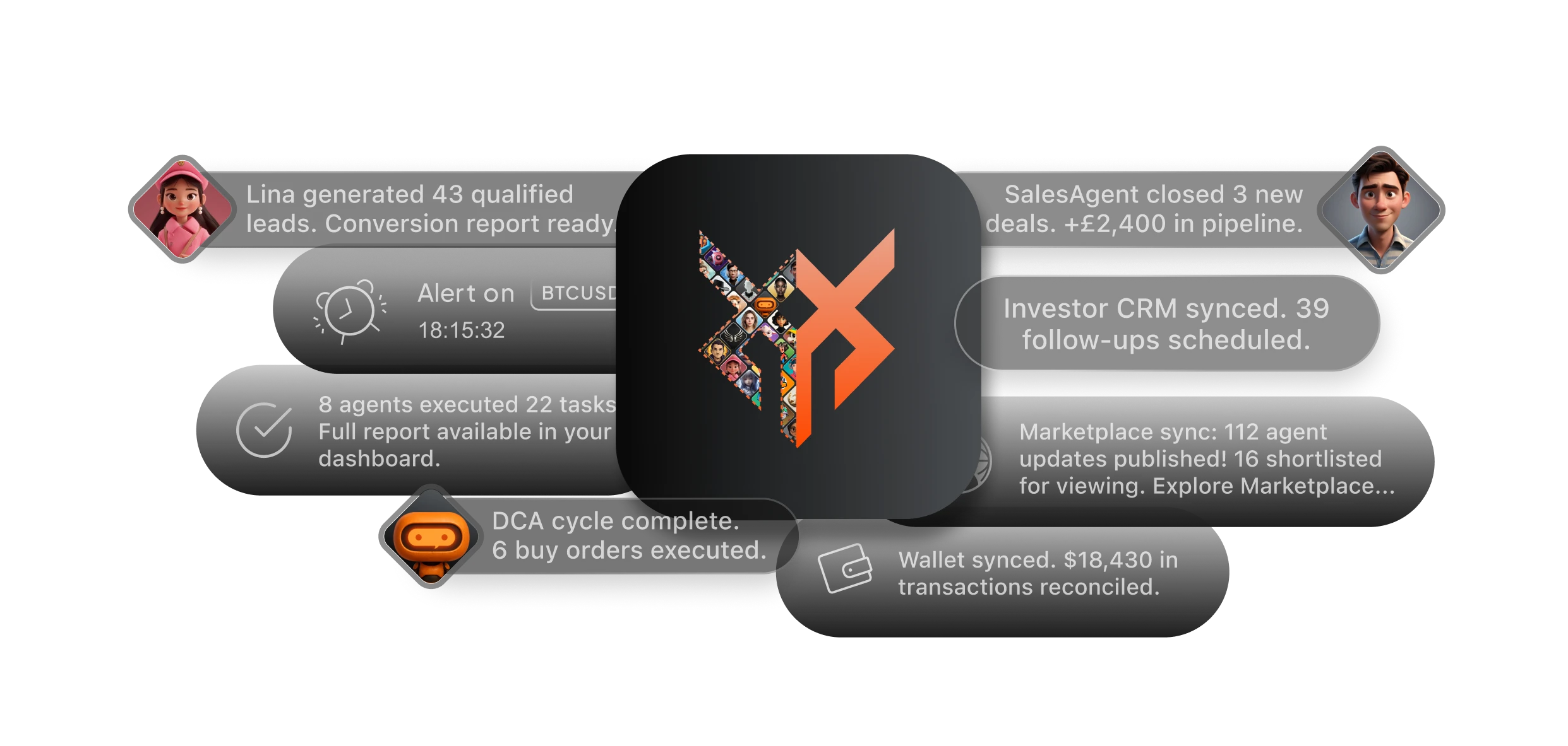 Oxiom is your command centre. Behind it, the Cross-Context Protocol (XCP) orchestrates AI agents, apps, and blockchain systems, executing tasks, verifying actions, and automating workflows across Web2 and Web3 securely.
